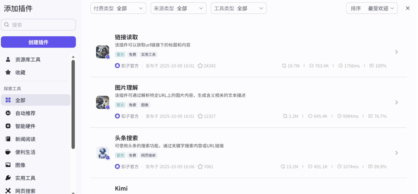 这个的话也比较好理解,就是这个智能体可以通过调用外部的一些软件,达到一些特定的效果,比如说问智能体今天的天气怎么样,路上堵不堵。这些问题的话我们就需要给智能体添加上天气预报和地图导航之类的插件,这样当我们询问时,智能体就会调用对应的插件来获取对应的信息。