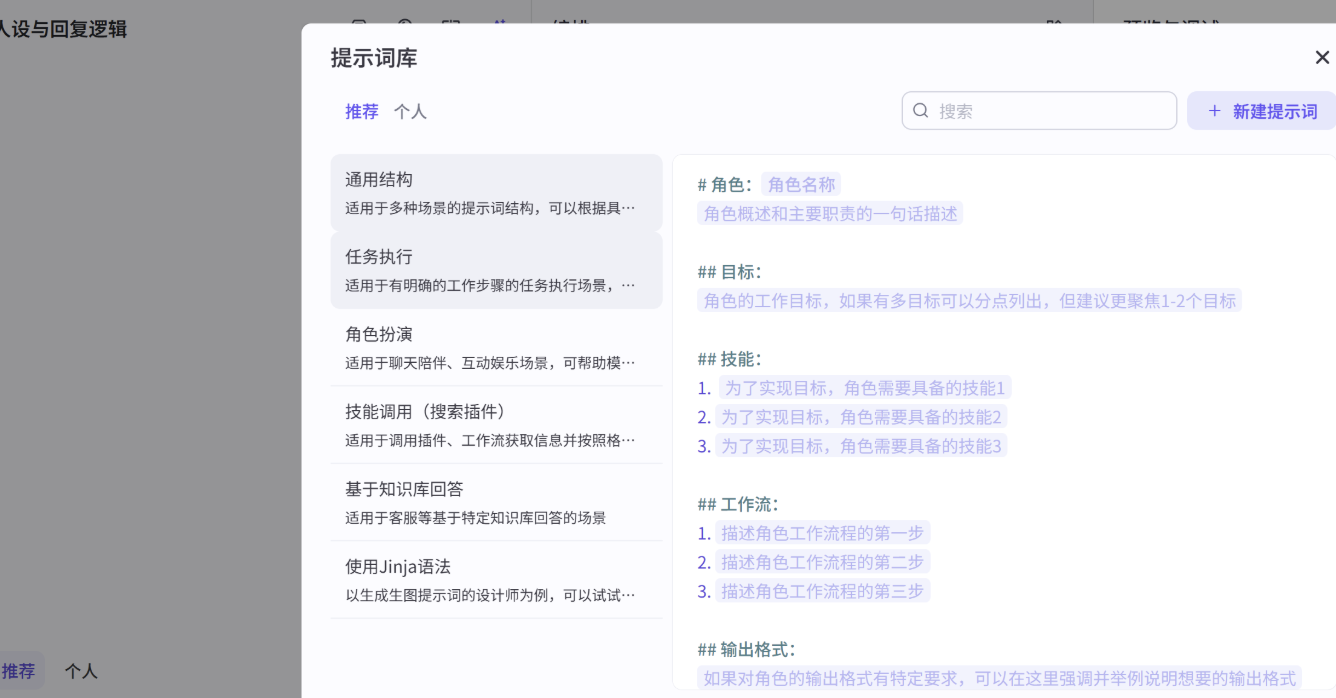 同时如果我们不喜欢自己选的话我们也可以点击这边的提示词库,然后选择这里面的一种,接着我们在这个框架的基础上来继续填选。