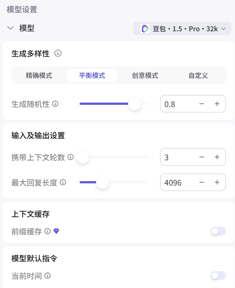这边的设置就是选择当前制作的智能体是基于哪一个AI大模型的,同时设置它的内容有多大程度是需要基于我们设置好的知识库,记忆等等内容。