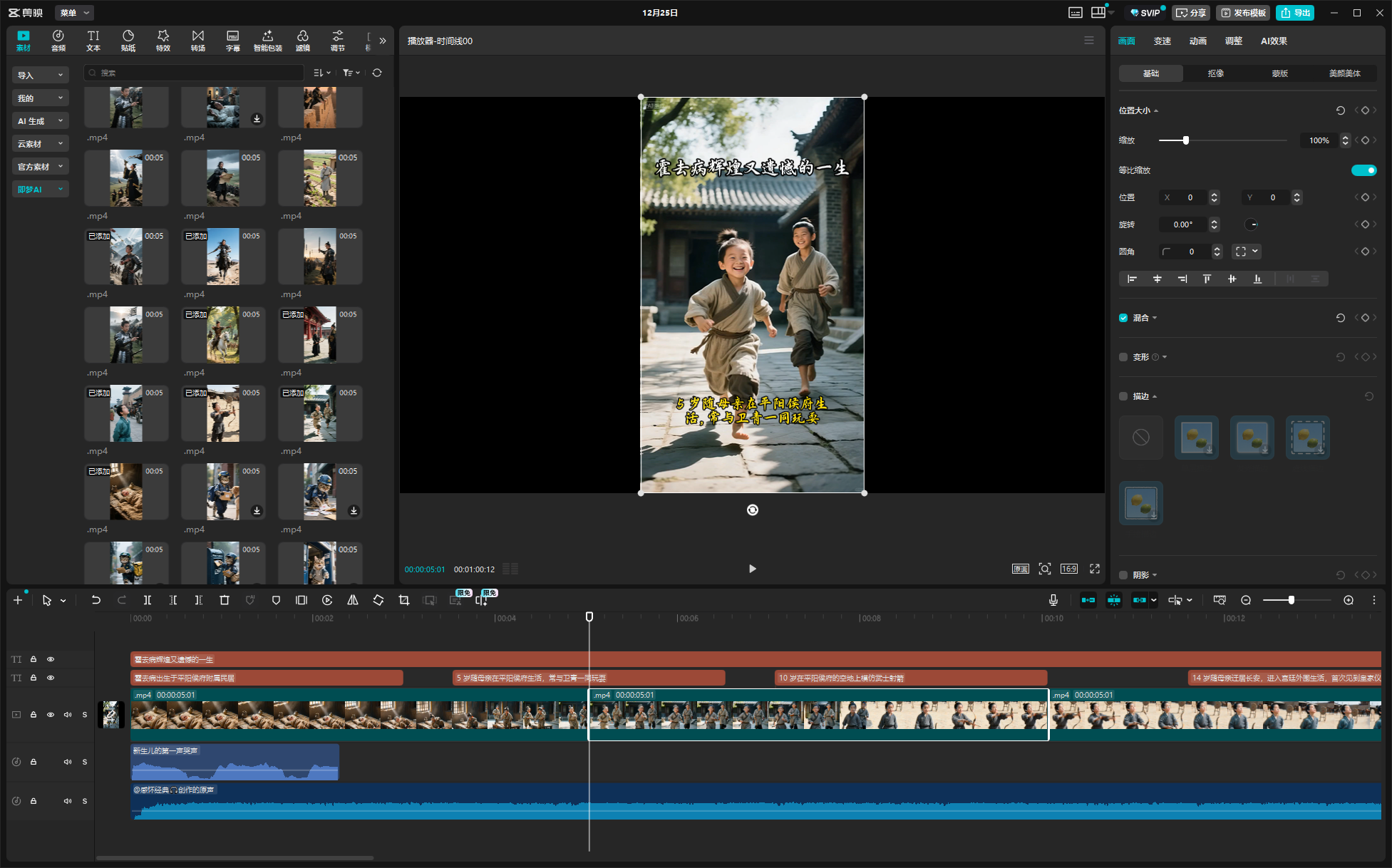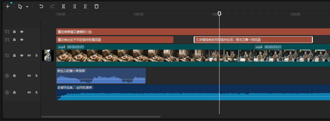 3、加 BGM 和音效:BGM 选“向天再借500年”,音量调小(不盖过画面氛围)关键节点加 “婴儿啼哭声” 音效,增强节奏感
