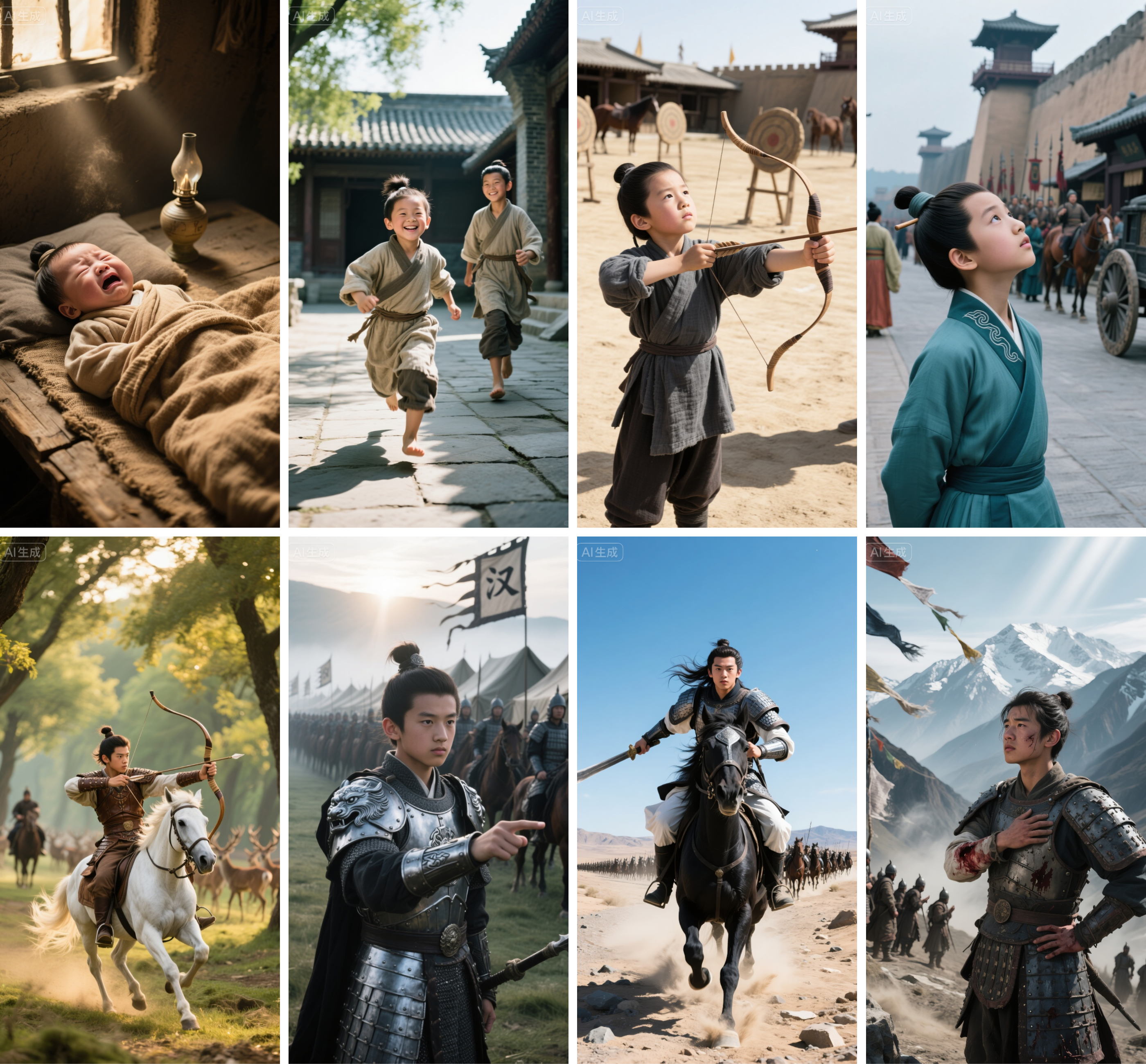 公元前 130 年(10 岁):展现出对骑射的浓厚兴趣,在平阳侯府的空地上模仿武士射箭,被卫青注意到其天赋。