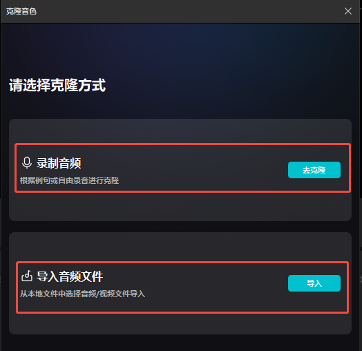 选择克隆方式,如果有录好的音频文件可以直接导入,如果是现场录制则点击“去克隆”: