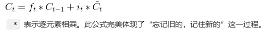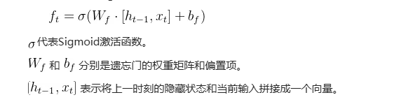 - 决定遗忘信息(遗忘门) :遗忘门读取ht-1和xt,然后输出一个0到1之间的数值,该数值与上一时刻的细胞状态Ct-1 按元素相乘,决定从旧记忆中遗忘哪些部分。值为0表示完全忘记,值为1表示完全保留。
