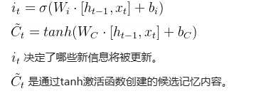 - 决定存入新信息(输入门) :输入门同样基于ht-1和 xt,决定哪些新信息是重要的。与此同时,一个tanh层会创建一个新的候选值向量~Ct,准备添加到细胞状态中。输入门的输出将与这个候选值向量相乘,以控制新信息的流入量。