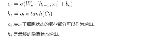 - 决定输出信息(输出门) :最后,输出门基于ht-1和xt,决定细胞状态中的哪些信息将被作为当前时间步的输出。细胞状态 Ct会先经过一个tanh函数进行处理(将其值缩放到-1到1之间),然后与输出门的输出相乘,最终得到隐藏状态ht,这个ht既是当前时刻的输出,也会作为下一时刻的输入之一。