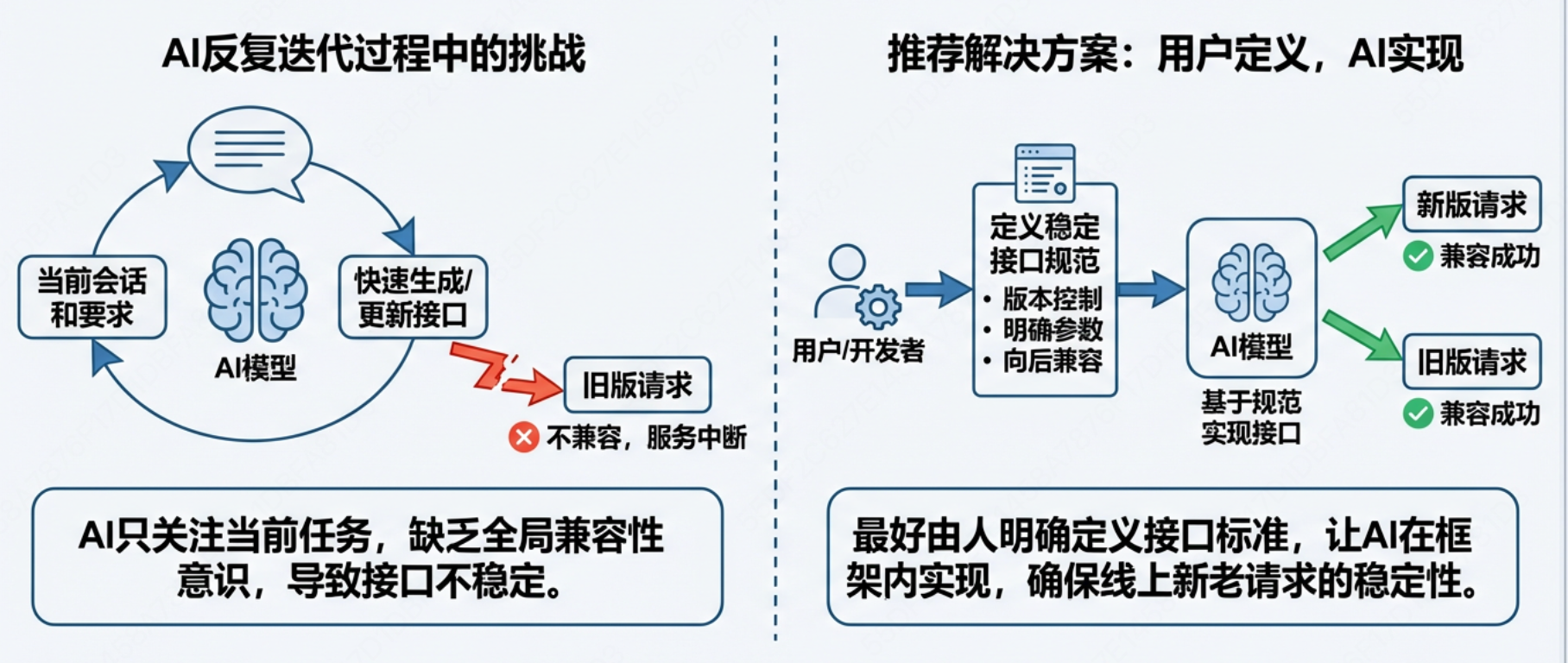 接口稳定性,这种通常出现在利用AI进行反复迭代的过程中,由于AI只对当前会话和要求负责,不会考虑线上新老请求的兼容性产生;