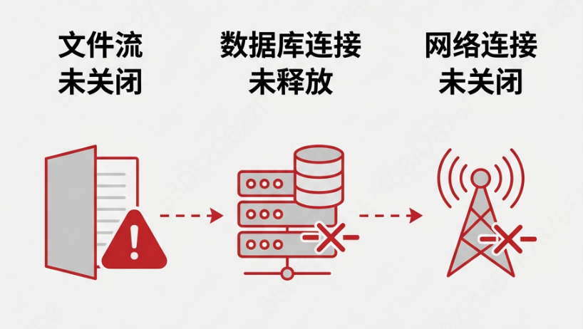资源泄漏在AI生成的I/O操作代码中尤为常见,包括文件流未关闭,数据库连接未释放网络连接,未关闭等