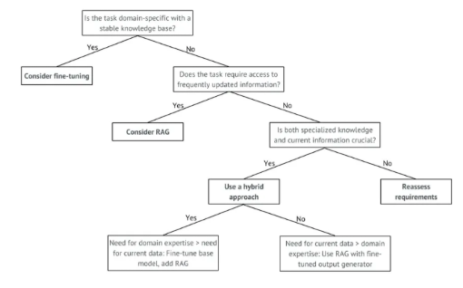 将所选方法与项目具体需求和约束对齐至关重要。需权衡推理速度、模型大小、适应性以及对外部知识库的依赖程度。某些情况下,结合 RAG 与微调的混合方法可能是最优解。