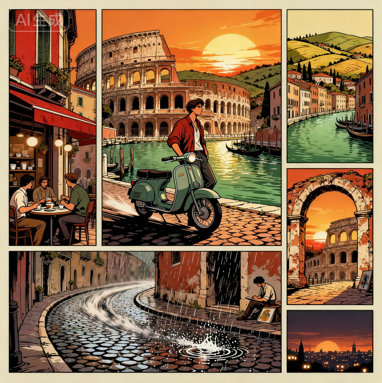 - 中心面板的焦点人物与背景融合(Center Panel Rule):中心总是以一个“人物锚点”为主角(如“放松的人物倚靠摩托车”或“时尚青年手持耳机”),象征读者代入感。背景则层层叠加标志性地标(如罗马斗兽场+威尼斯运河),营造“传统与现代交织”的都市生活主题。