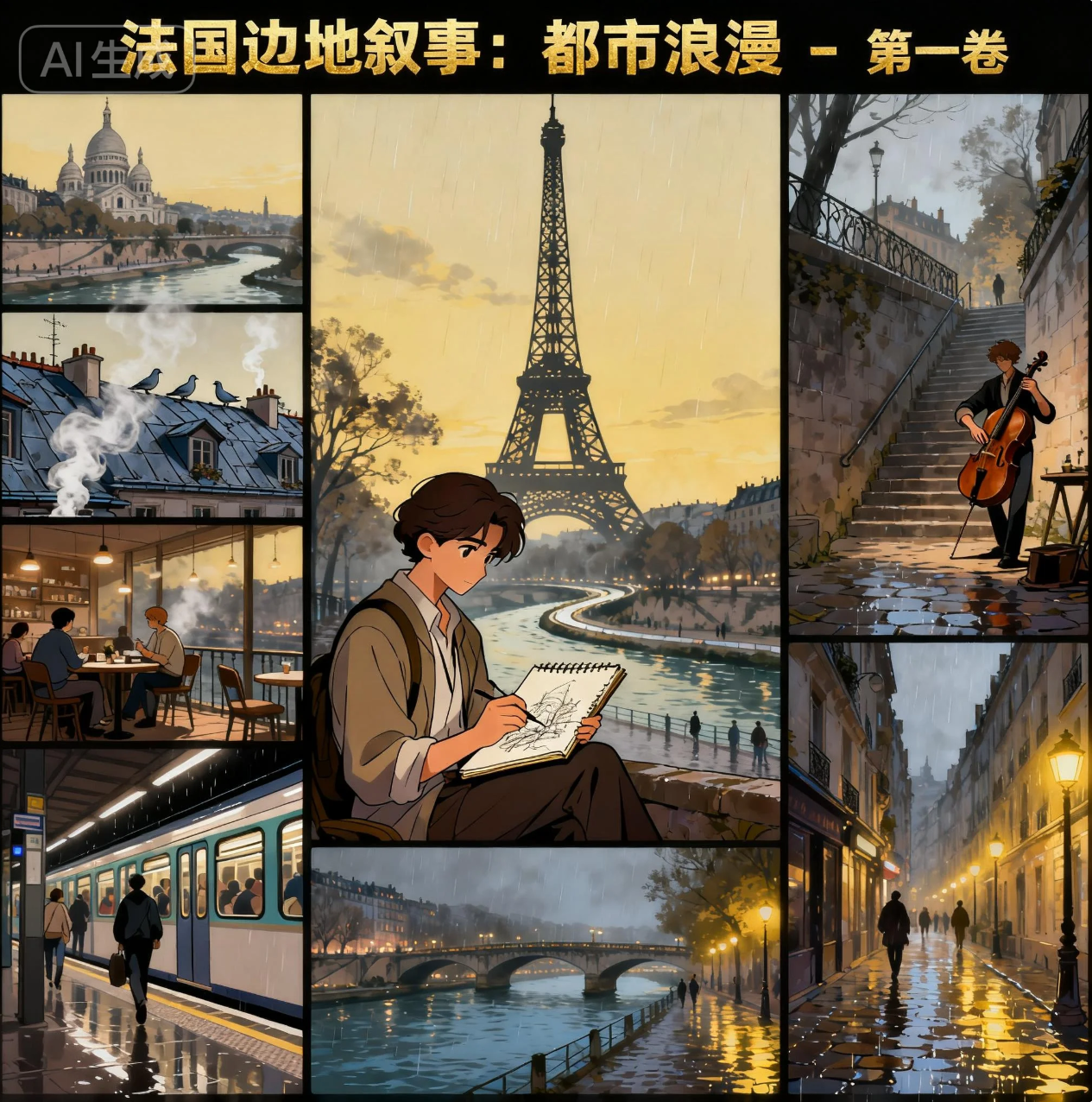 实操提示:强调“电影滤镜”可让海报更具文艺感,适合法国旅行书的“情感叙事”。这解决了“浪漫主题易落俗套”的痛点,通过网格扩展场景,读者能“预览”书籍的章节节奏。