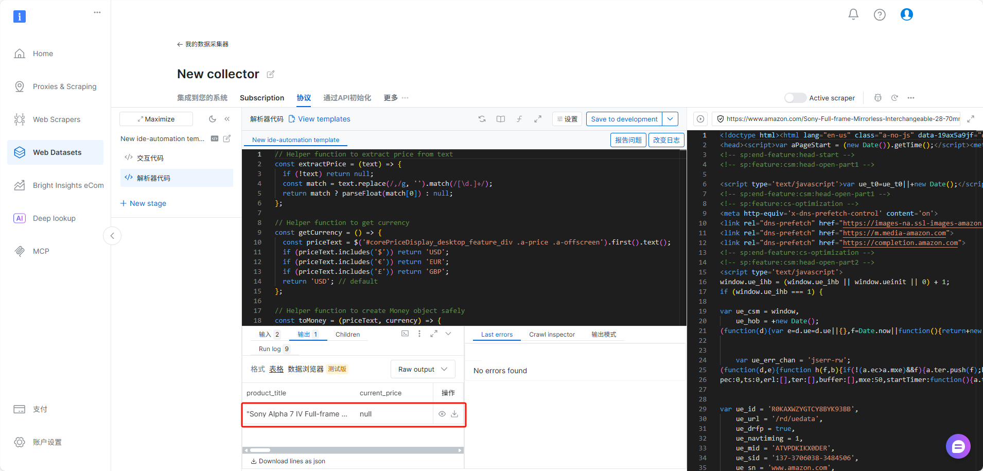 - 自然语言开发:仅需用简单的中文或英文描述采集需求(如"抓取该网站所有产品的标题、价格和评论"),AI在10-15分钟内自动生成可运行的爬虫脚本