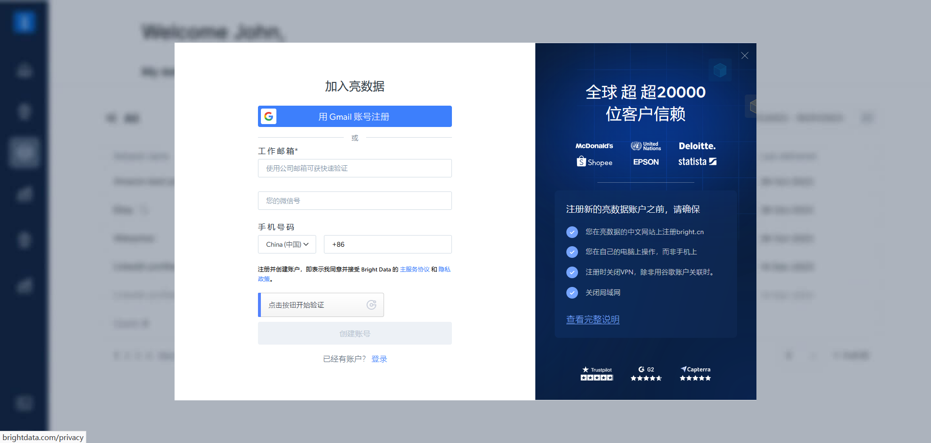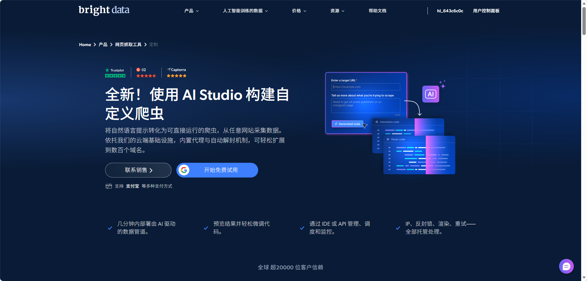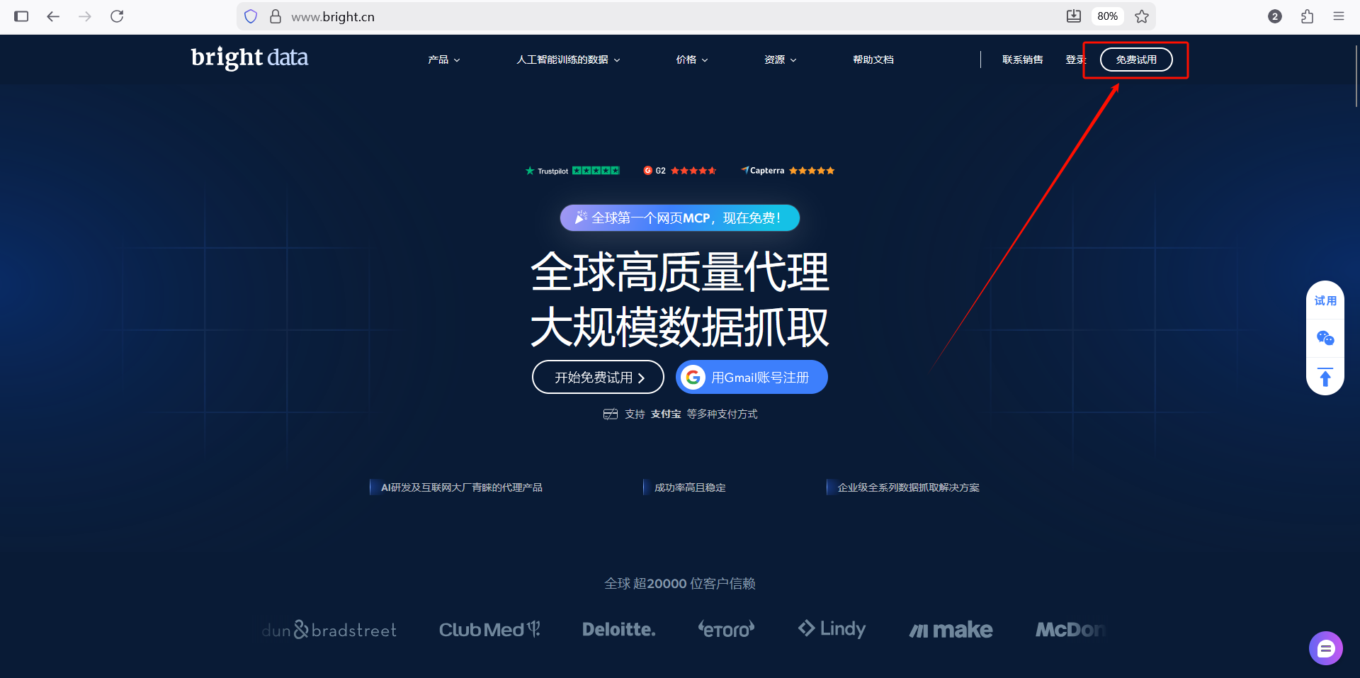 - 注册 Bright Data 账号并进入 AI Scraper Studio 免费试用 打开 Bright Data 官网,点击试用进行创建账号