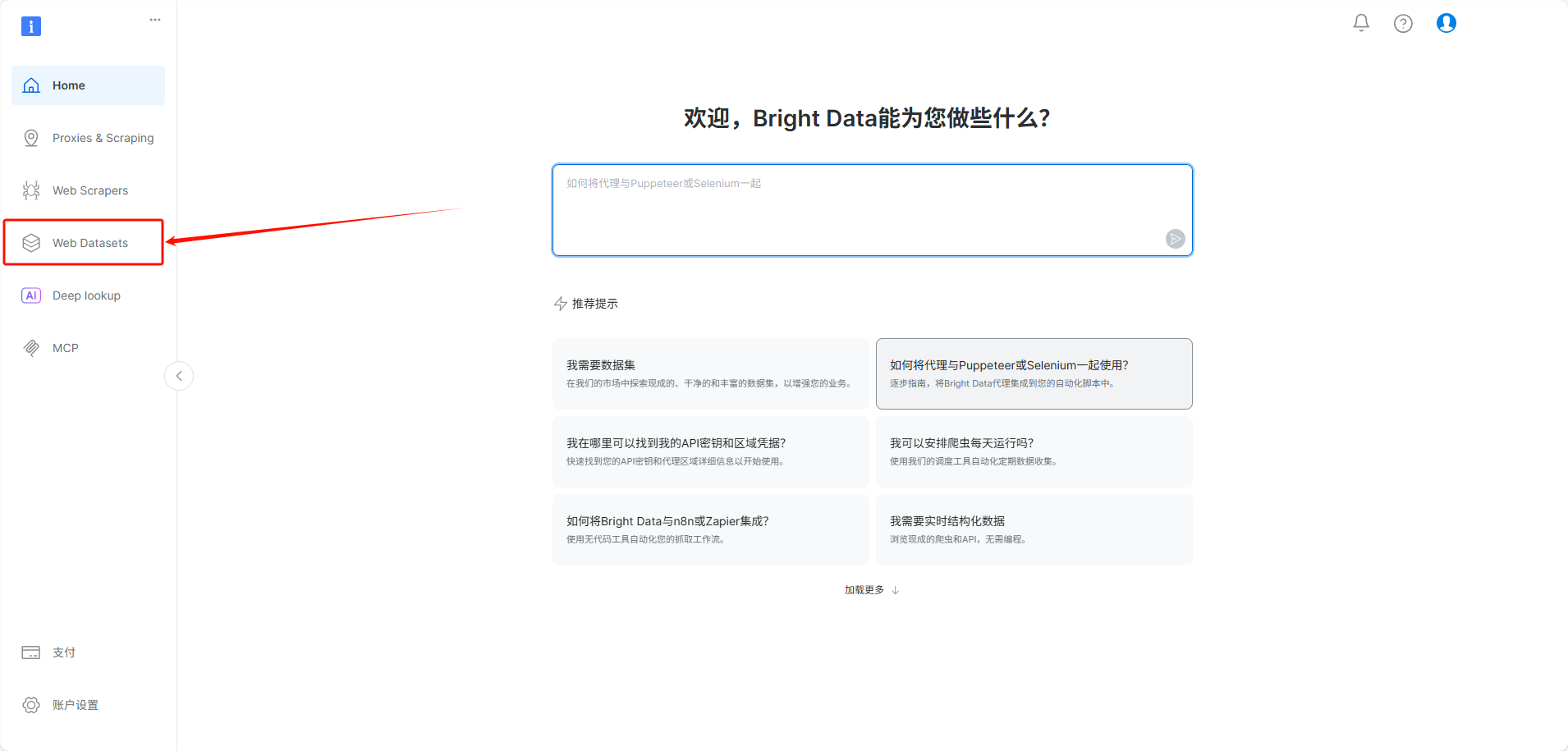 完成后即可进入亮数据控制台页面,按照如下步骤即可进入 AI Scraper Studio。该模块内置若干免费额度,无需配置代理或环境,也无需提前准备任何代码,适合快速验证抓取需求。
