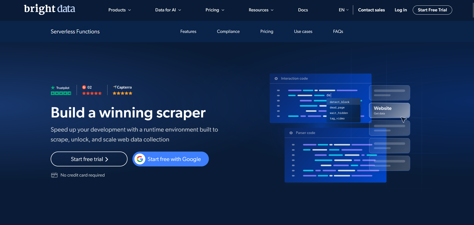 完全托管的 JavaScript 爬虫解决方案,专为开发者设计,可快速、大规模构建爬虫。基于 Bright Data 的解封技术构建,IDE 包含来自主要网站的预置 JavaScript 函数和代码模板,大幅减少爬虫开发和维护时间。