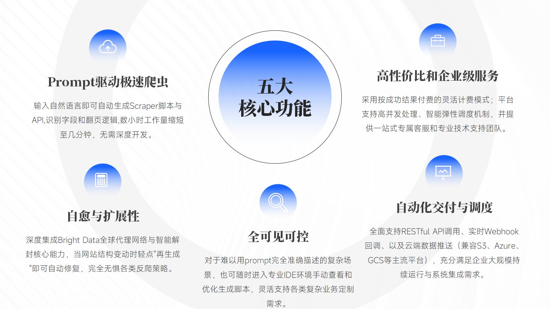 "Prompt 生成爬虫"正是对这种矛盾的系统性回应。它让采集任务回到"业务描述"层面,让AI理解页面、推断结构、生成脚本,并在结构变化时自动重写逻辑。对企业而言,这意味着从"人力驱动的脚本时代"迈向"AI驱动的数据基础设施时代"——业务需求更快落地,技术团队从无休止的脚本维护中解放,把能力投入到更高价值的模型、产品和策略中。