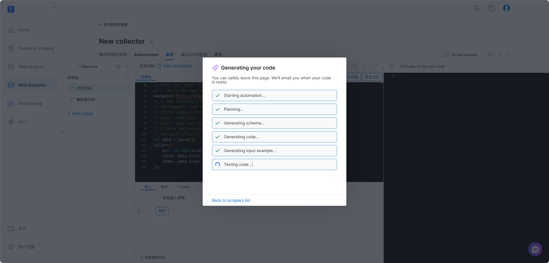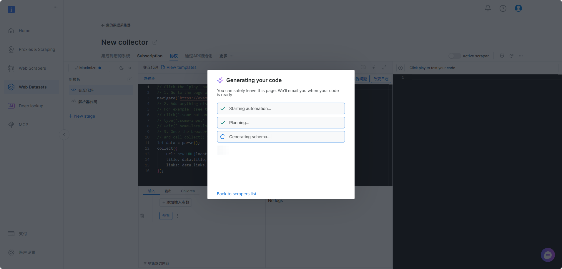 - Studio 自动生成并部署可运行的爬虫代码 提交 Prompt 后,AI Scraper Studio 会自动读取网页结构、生成相应的抓取逻辑,并直接部署到云端运行。整个过程不需要你编写 Python、Node.js 或 Puppeteer 程序,也不需手动处理分页、详情页跳转或等待动态加载。