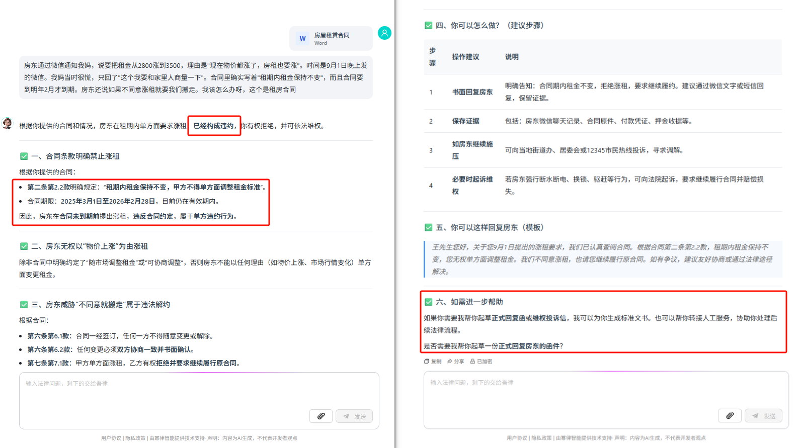 几分钟后,它给出了分析:房东的行为明显违约,因为合同里写着"租期内租金不变"。