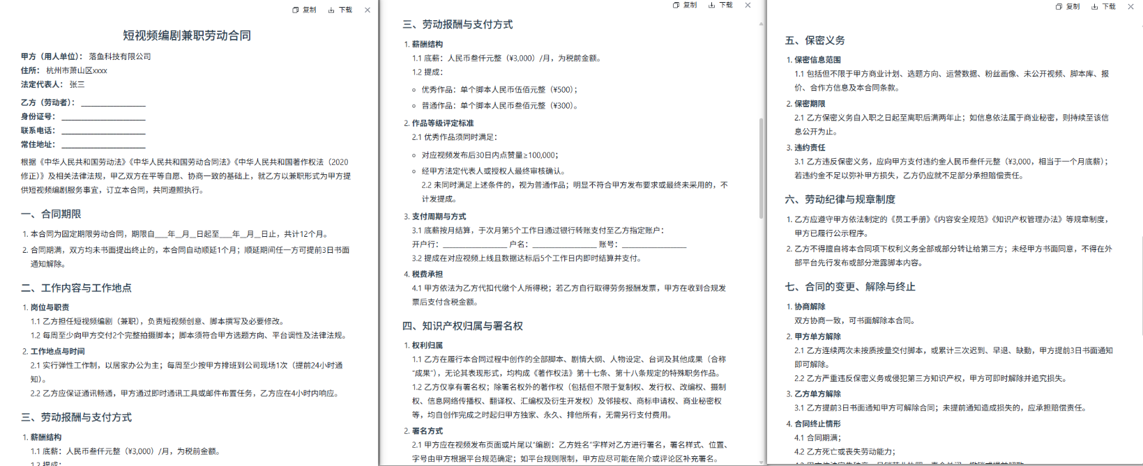 整份合同看下来,比我之前网上下载的那些模板专业太多了。不仅覆盖了所有法律要点,还充分考虑了新媒体行业的特殊性。我把合同给公司的法律顾问看了一下,他说基本不需要修改,直接就能用。