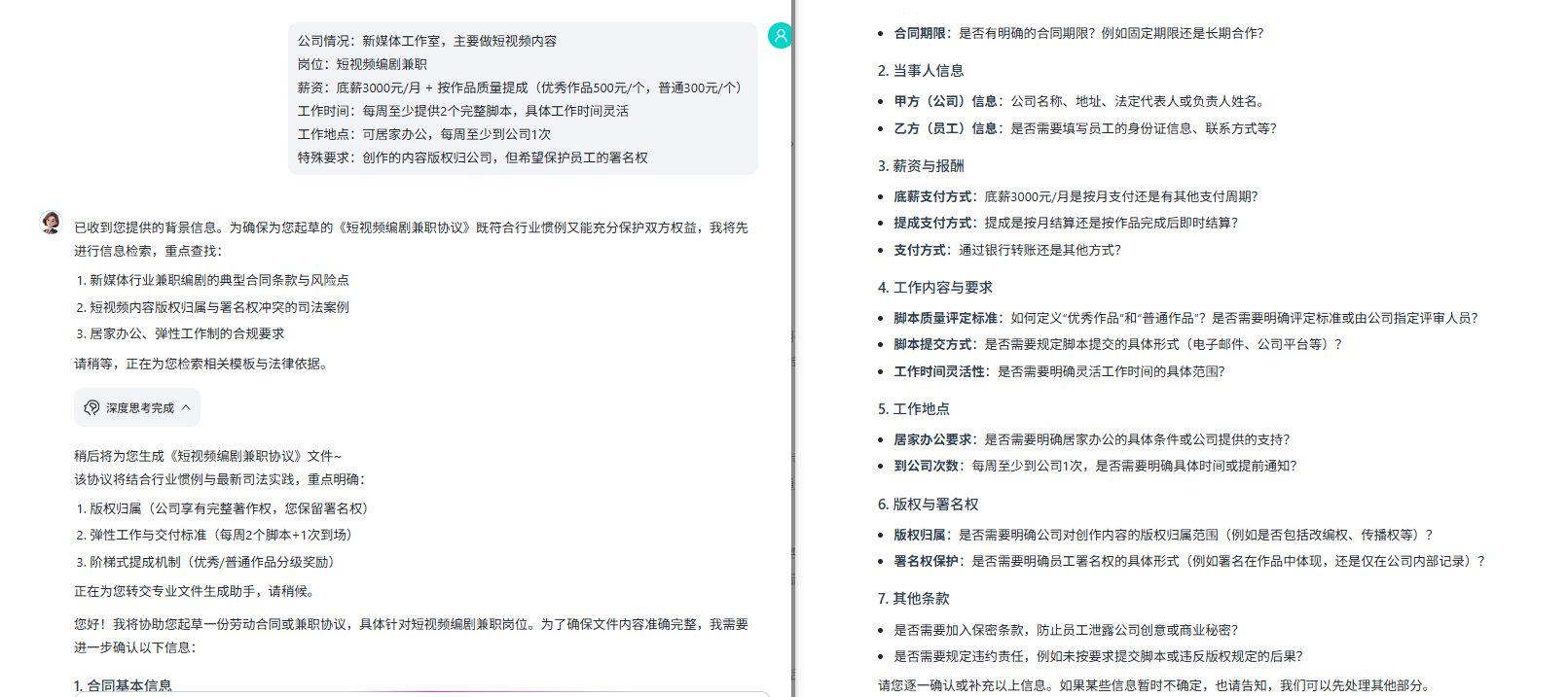 收到这些信息后,开始了一个挺有意思的过程。它不是直接生成合同,而是先告诉我说要"进行信息检索,重点查找新媒体行业兼职编剧的典型合同条款与风险点"。