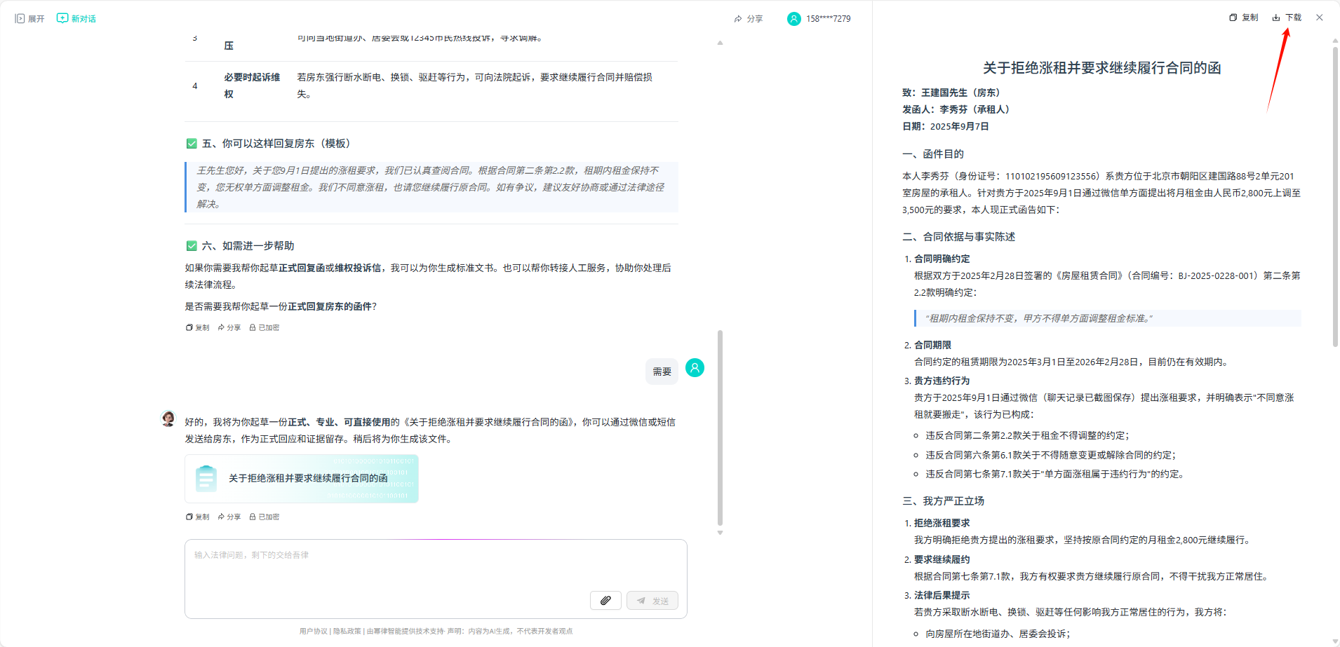 更厉害的是,它直接帮我起草了一份给房东的函,用词很专业,既指出了违约事实,又给对方留了台阶,而且生成的《关于拒绝涨租并要求继续履行合同的函》还可以一键下载为word,直接可以给房东发过去。