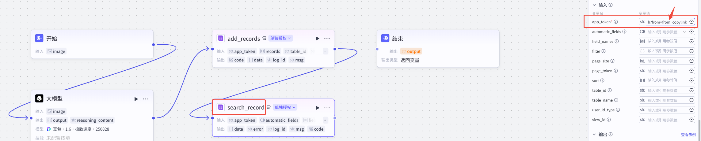 选择功能:search_record(查找记录),将刚才复制的飞书多维表格链接粘贴进去。