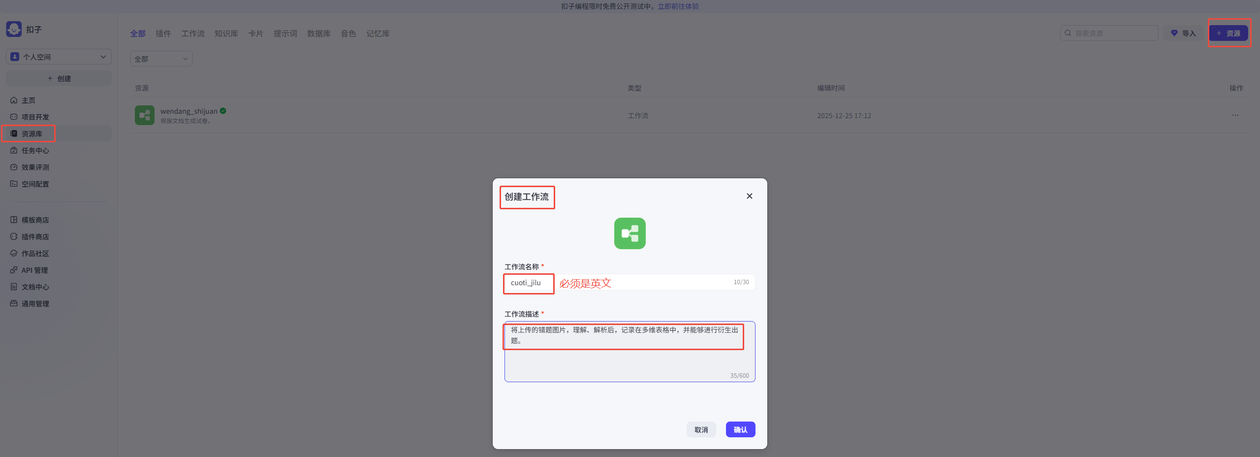🖱 进入 扣子 Coze(https://www.coze.cn)【扣子编程】→【资源库】→【新建工作流】