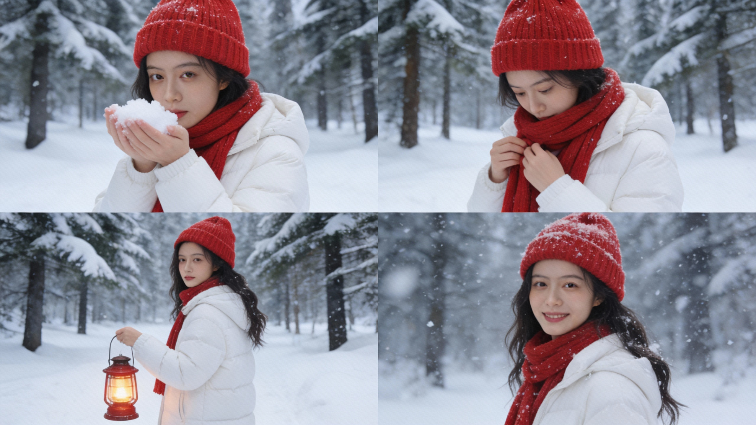 生成一张四宫格拼图,唯美电影写真风。背景是北海道的厚厚积雪和针叶林。主角身穿纯白色的羽绒服,戴着鲜红色的针织帽和围巾,色彩对比强烈。四个动作分别为:1. 手捧一捧洁白的雪花凑近脸庞,眼神清澈;2. 低头认真整理红色的围巾,下半张脸埋在围巾里;3. 提着一盏发着暖光的复古红灯笼,在雪地里侧身回望;4. 站在漫天飞雪中,氛围感拉满。画面干净,红白撞色,光线柔和。
