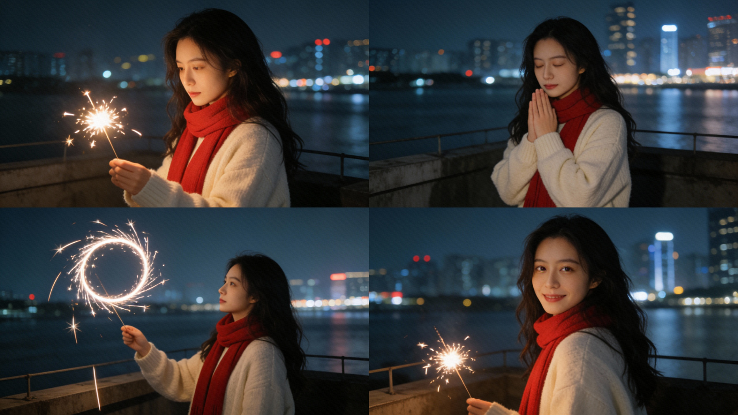 生成一张四宫格拼图,日系胶片风格。场景是夜晚的江边或天台。女生穿着米白色的厚毛衣,围着红色围巾。四个动作分别为:1. 看着手中的仙女棒,火光照亮脸庞;2. 双手合十闭眼许愿,神情虔诚;3. 拿着燃烧的仙女棒在空中画出光圈,光轨清晰;4. 在烟火即将燃尽时回眸一笑,眼神温柔。背景是城市的万家灯火,光影朦胧唯美。