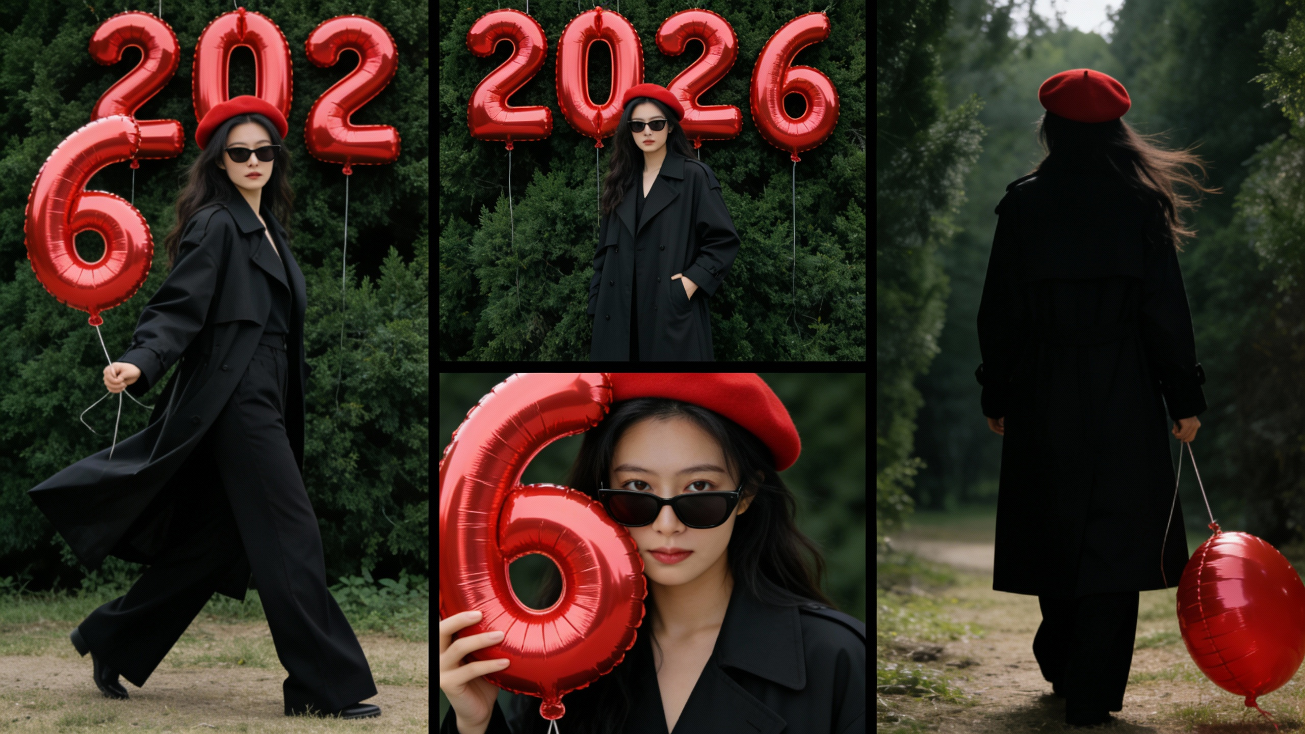 生成一张四宫格拼图,高级极简时尚街拍风格。主体人物是一位酷飒氛围感女生,身着黑色长款廓形风衣,搭配黑色阔腿裤,头戴红色贝雷帽,佩戴黑色墨镜,长发自然垂落,妆容精致高级。背景环境是茂密的深绿色常绿树丛,自然的冷调背景。色彩为红黑撞色搭配深绿底色。四个动作分别为:1. 动态抓拍迈步向前走来的瞬间,风衣衣摆带风,手中随意拽着一个大尺寸红色数字“6”铝箔气球,背景树上挂着“202”红色气球,组成“2026”,姿态松弛自信;2. 站在挂有2026红色气球的背景前,单手插兜,重心微微后倾,隔着墨镜看向镜头,神情慵懒且酷拽;3. 将红色的“6”字气球举在脸侧作为前景遮挡,微微压低墨镜露出犀利的眼神,红唇与红气球呼应,时尚感极强;4. 转身向树林深处走去的背影,只留下一个潇洒的黑色风衣剪影,手里拖着红色气球,发丝被风吹起,画面充满电影质感的叙事张力。整体氛围光线自然高级,强调红黑绿的色彩冲击力,情绪松弛又带有强大的气场。