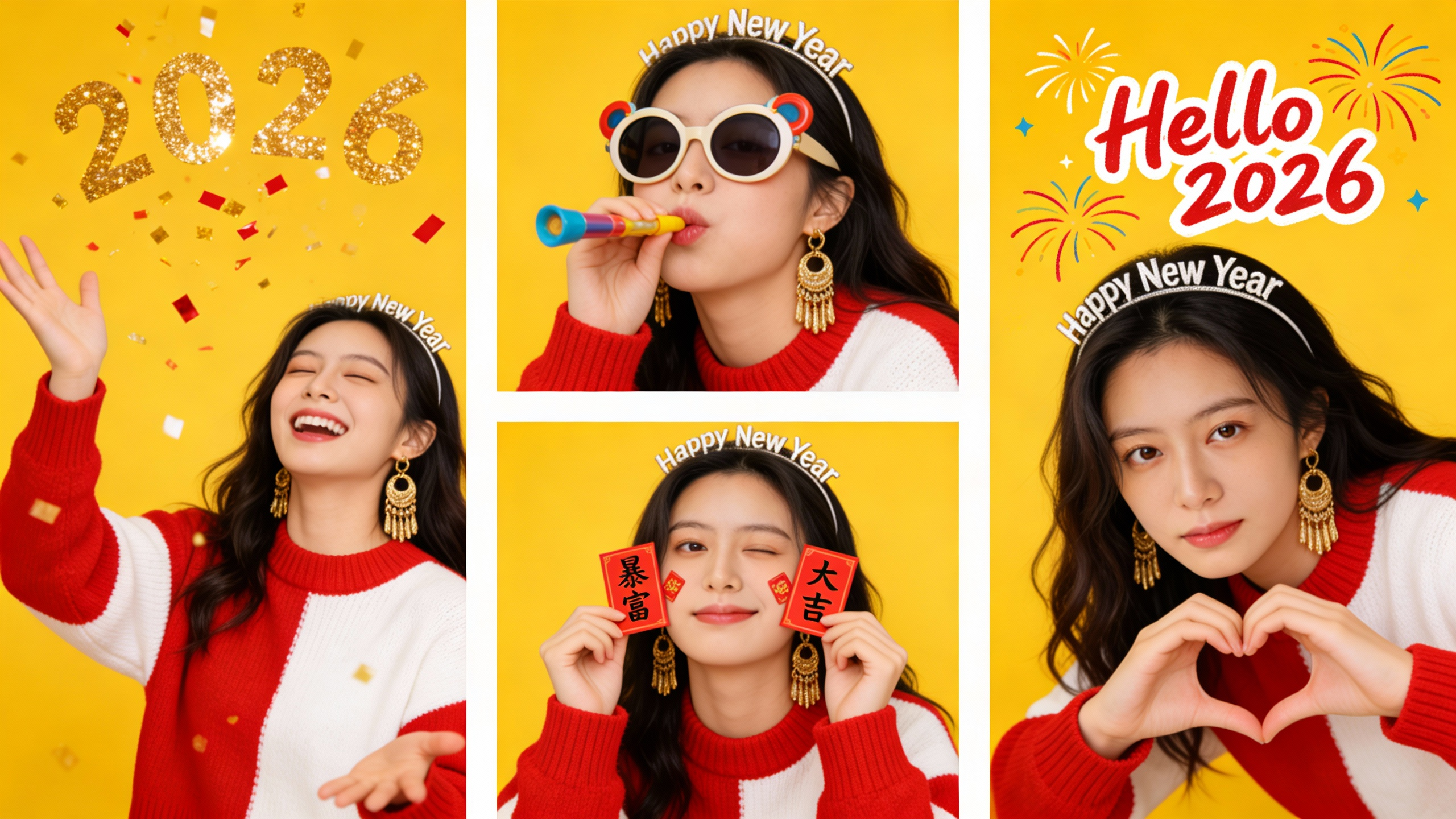 四个动作分别为:1. 向空中抛撒金色的“2026”数字亮片和红色碎片,闭眼大笑,氛围热烈;2.戴着造型夸张的“2026”形状搞怪眼镜,用力吹响派对口哨,脸颊鼓鼓,可爱满分;3. 双手拿着两张写着“暴富”和“大吉”的迷你红对联贴在脸颊两侧,俏皮Wink;4.身体前倾靠近镜头,双手比出大大的爱心,背景有手绘涂鸦风的烟花和“Hello 2026”字样。