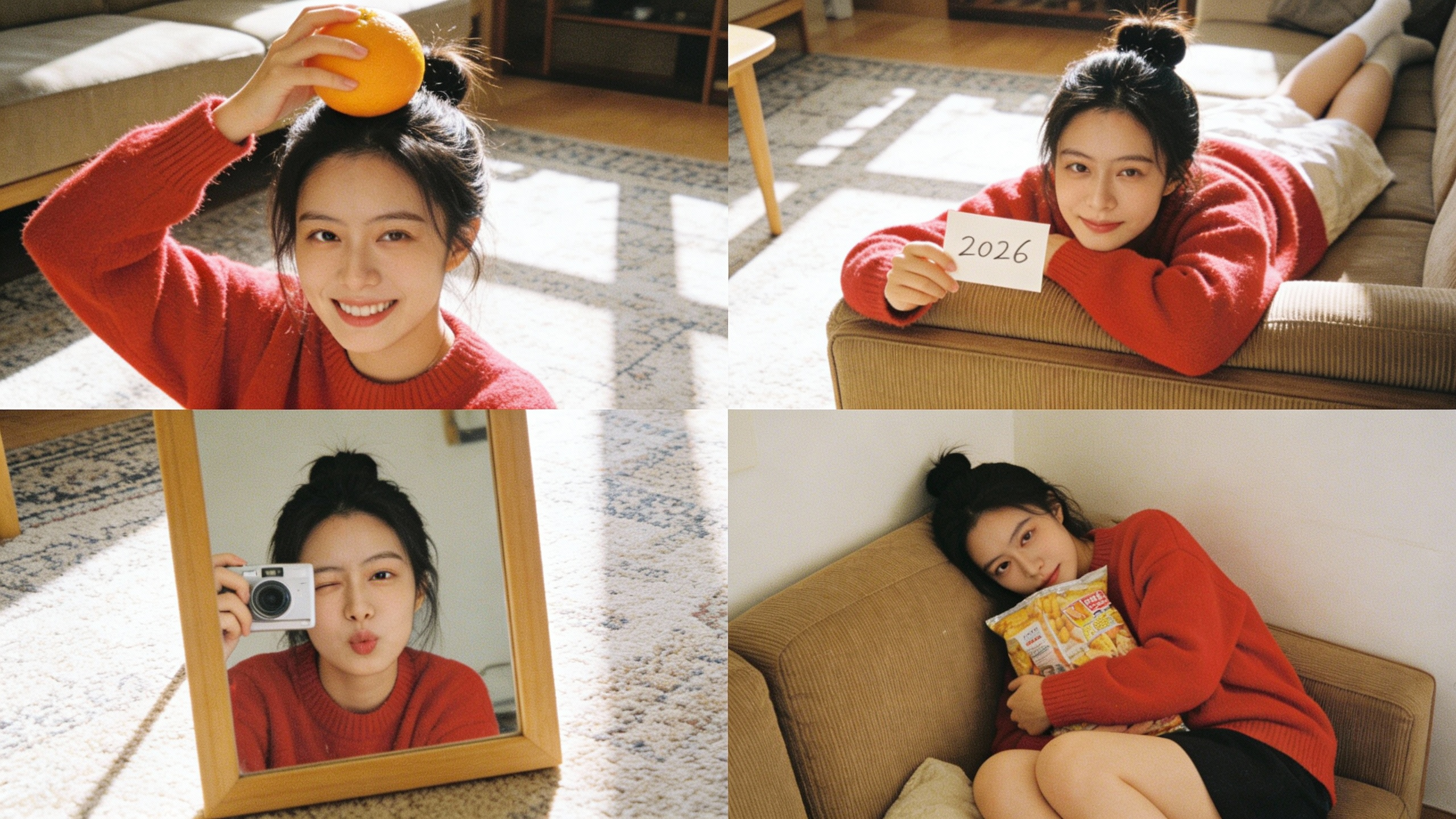 生成一张四宫格拼图,日系生活类杂志风。场景是温馨的客厅,阳光洒在地毯上。女生穿着舒适的红色毛衣,丸子头慵懒随意。四个动作分别为:1. 调皮地把一个大橘子顶在头顶,寓意“大橘大利”;2. 趴在沙发背上,手里拿着写有“2026”的手写卡片,笑容灿烂;3. 对着镜子里的自己做搞怪鬼脸,拿着相机自拍;4. 蜷缩在沙发角落,怀里抱着零食袋,惬意放松。色调暖黄,充满胶片的高级生活质感。