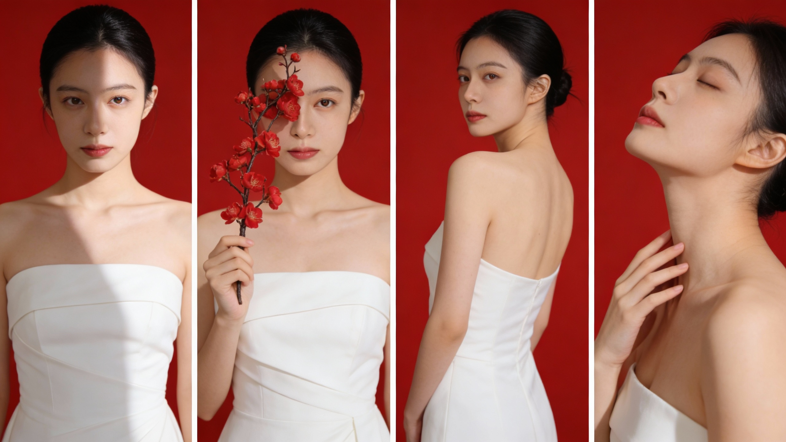📋 复制提示词:生成一张四宫格拼图,极简主义艺术人像,大师级布光。纯正红色背景。女生穿着设计感极强的白色极简礼服。四个动作:1. 正脸直视镜头,眼神坚定,光影切割面部;2. 手拿一枝红梅遮住一只眼睛,极具张力;3. 背对着镜头微微侧头回眸,露出优美的肩颈线条,神情清冷疏离,大面积留白;4. 头部微微后仰,一只手优雅地轻抚颈部或锁骨,闭目沉浸,面部轮廓光清晰,极具雕塑感。画面干净利落,时尚杂志封面感,构图大胆。