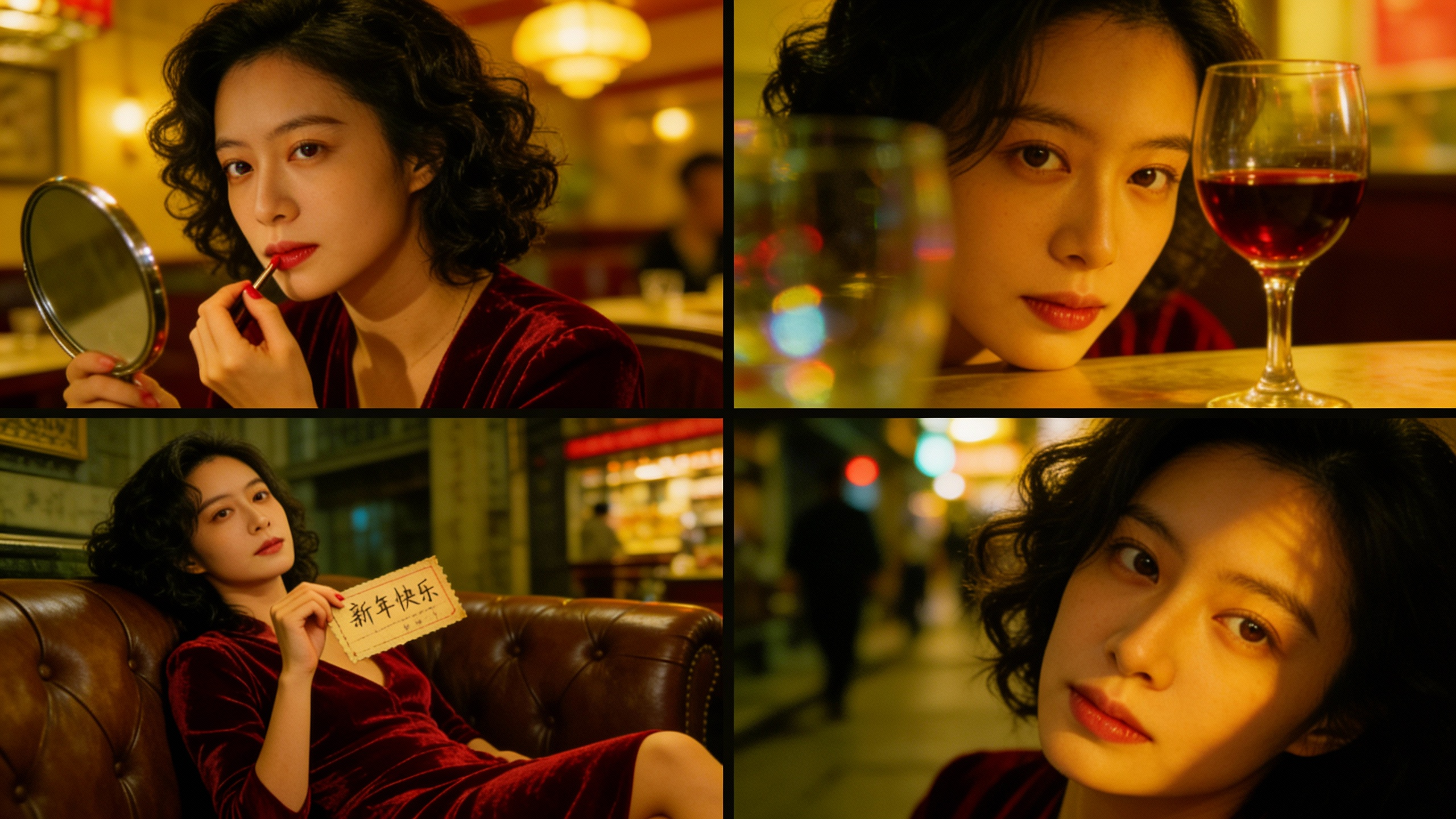 生成一张四宫格拼图,王家卫《繁花》电影美学风格。场景是昏黄复古的餐厅或老上海街道。主角留着复古卷发,穿着丝绒红裙,妆容浓艳。四个动作分别为:1. 对着小圆镜仔细涂抹复古红唇,眼神迷离;2. 隔着装有红酒的高脚杯看向镜头,画面有玻璃折射的梦幻感;3. 慵懒地靠在真皮沙发上,手指夹着一张“新年快乐”的旧船票;4. 眼神流转,在斑驳的光影中回眸,故事感十足。色彩浓郁油润,光影层次丰富。