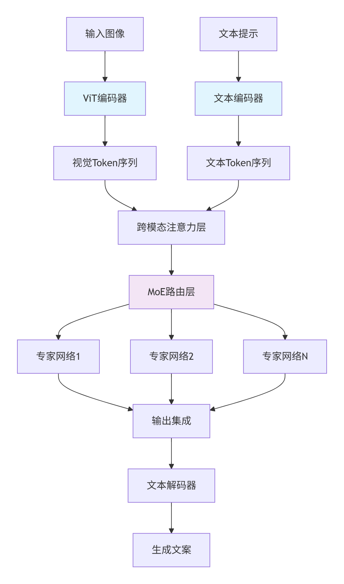 模型架构的核心创新体现在三个层面:视觉编码器的分块处理策略、文本解码器的条件激活机制,以及两者间的跨模态注意力融合。视觉通路采用Vision Transformer(ViT)将输入图像分割为16×16的图块,通过线性投影转换为视觉token序列。语言通路则基于因果Transformer架构,通过交叉注意力层整合视觉信息。