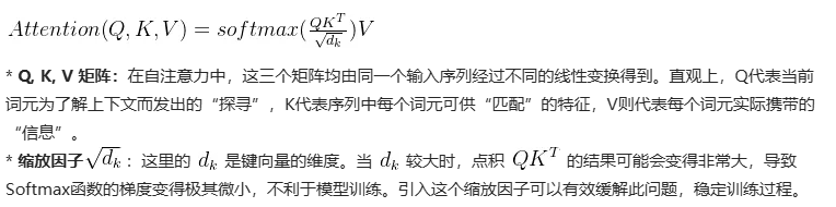 缩放点积注意力(Scaled Dot-Product Attention): 这是Transformer中使用的具体注意力实现。其输入为三个矩阵:查询(Query, Q)、键(Key, K)和值(Value, V)。其计算过程可以概括为:首先计算查询与所有键的点积,然后除以一个缩放因子,接着通过Softmax函数得到权重,最后将这些权重应用于值。