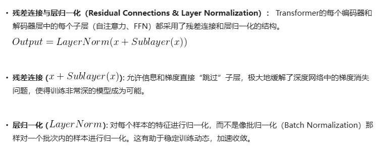 为了实现深度网络的有效训练,每个子层的输出都采用了 残差连接(Residual Connection) ,并随后进行 层归一化(Layer Normalization) 。