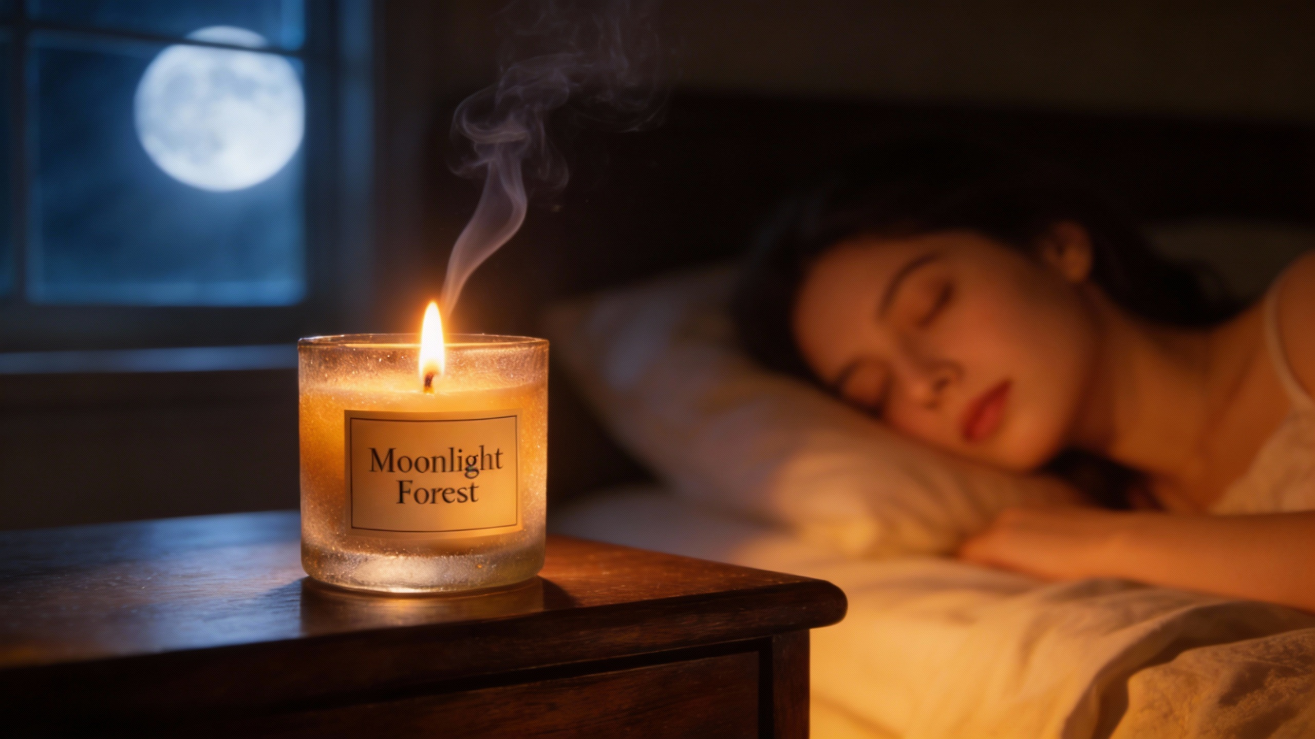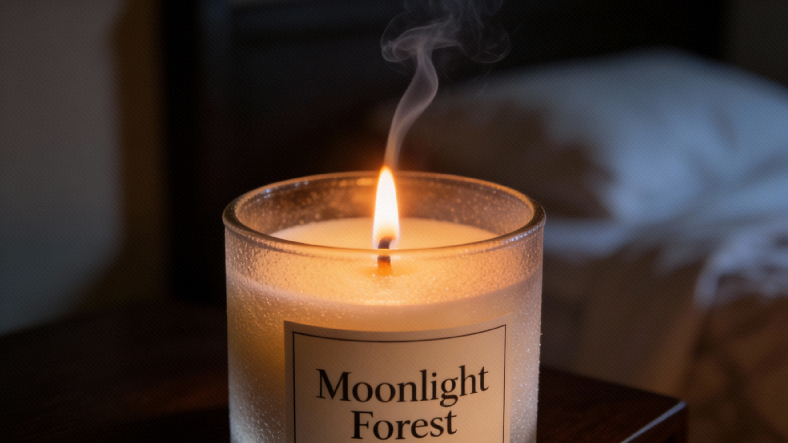 高级香氛蜡烛特写,磨砂玻璃瓶身,瓶身标签清晰可见写着"Moonlight Forest",放置在深色胡桃木床头柜上。电影级布光,清冷的月光透过窗户射入形成蓝色轮廓光,背景是模糊的舒适卧室,浅景深,8k分辨率,超写实,优雅宁静的氛围,微尘在光线中飞舞。