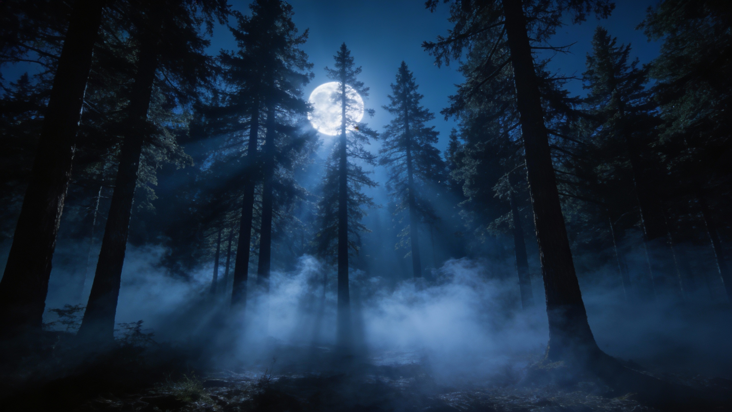 梦幻的夜晚森林场景,皎洁月光透过高大的松树洒落,地面弥漫着浓厚的神秘雾气,丁达尔效应,冷蓝色和银色调,空灵,宁静,自然摄影,广角镜头,电影质感,细节丰富。