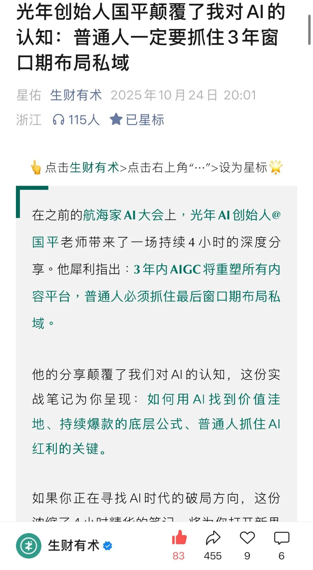 这是一篇被国内头部社群 生财有术 官方公众号转载发布的文章,其中「如何用AI重新构建增长流量」的内容,来自光年AI创始人张国平老师,也是国内流量神级大佬。SHEIN、安克创新、美团等产品的增长,都有他的战略和操盘。