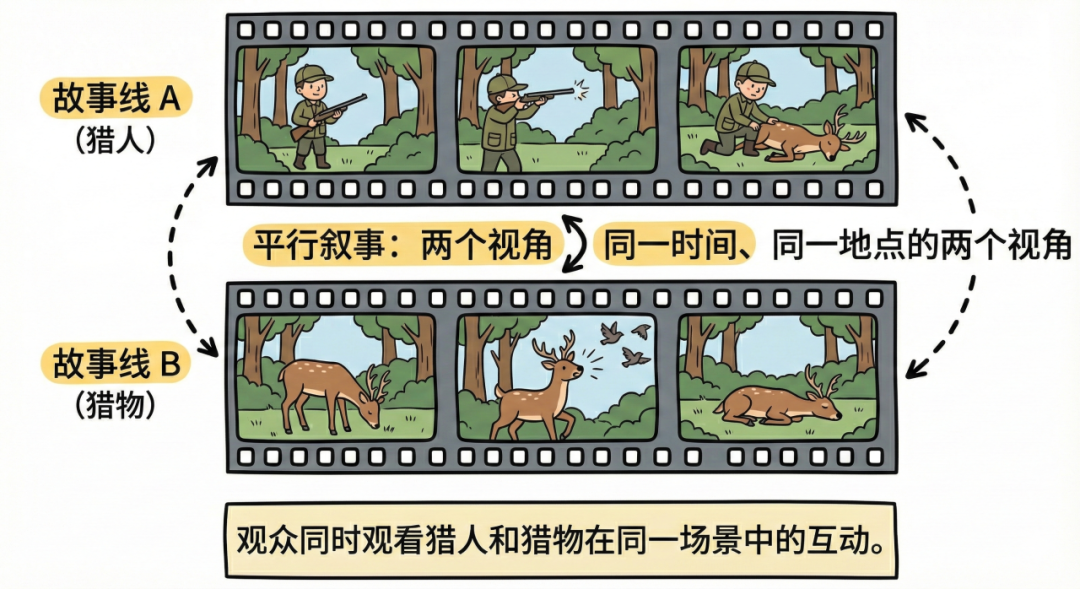 我举个例子:猎人在森林里打鹿这个情节,平行叙事怎么做?
