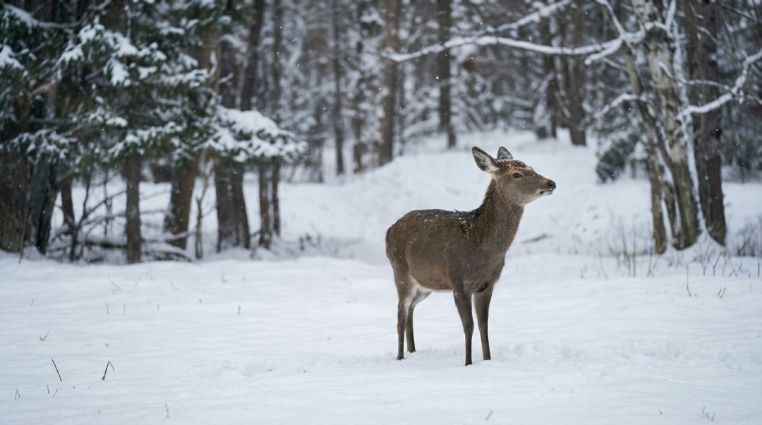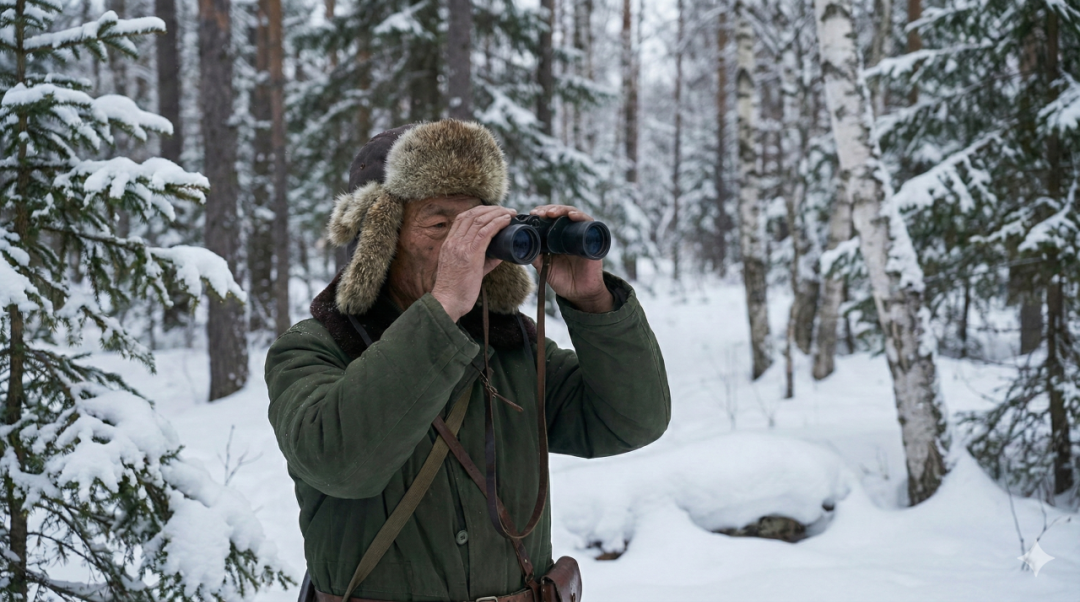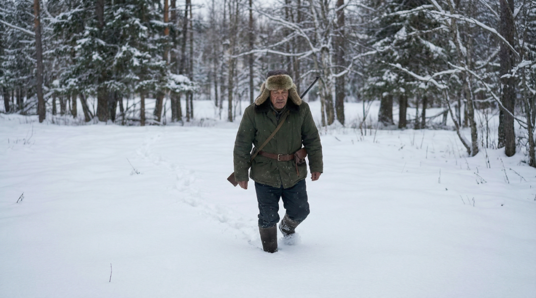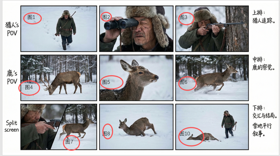 非常好,我需要你生成一个中国老猎人在雪地里捕猎一头鹿,要求33个故事版的图片,用平行叙事的手法,镜头语言丰富一些,真人风格。