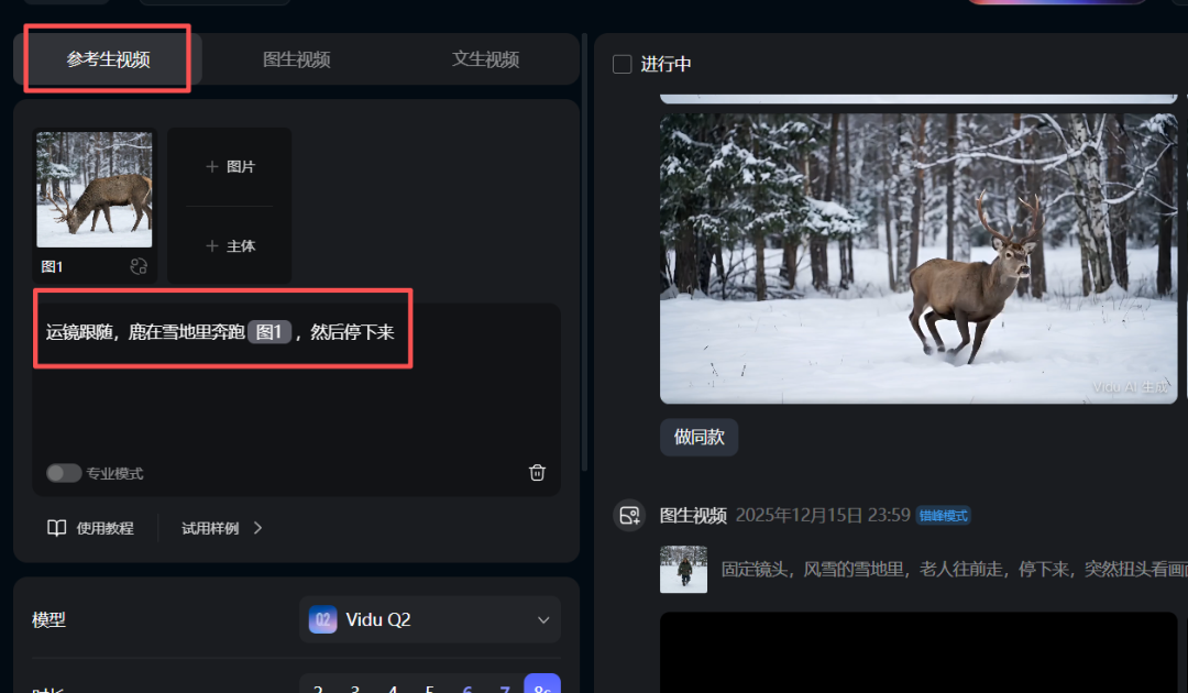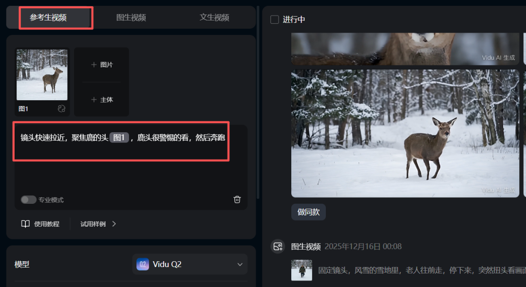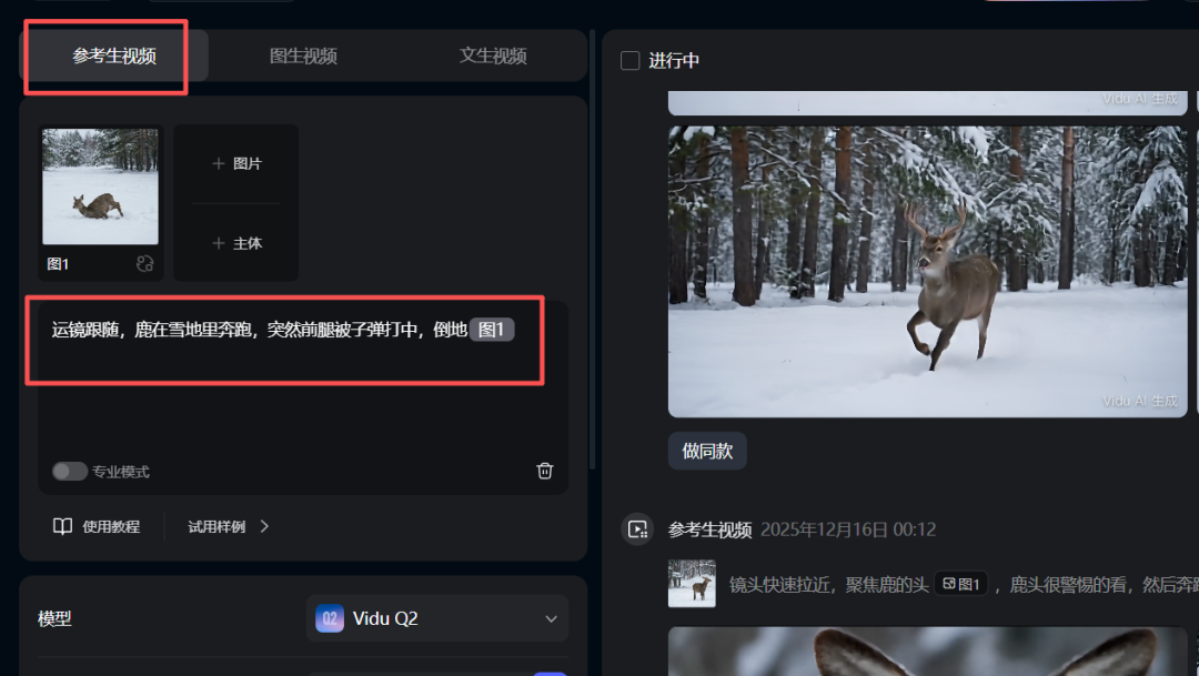 参考生视频是因为能够让画面更加具有联想性,图片里面比方只有鹿倒地的画面,这个视频描述的是鹿被击中倒地,图生视频的话vidu做不到,只有海螺(尾帧功能可以),就选择了vidu参考生视频。