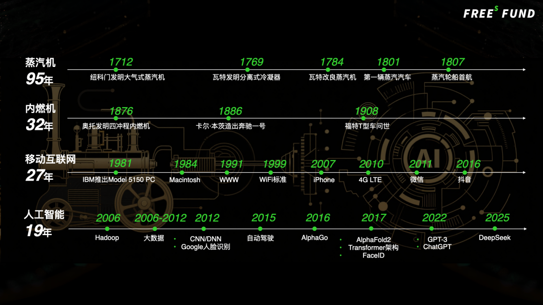 AI成为这次中美科技竞争的核心,就是因为大家都认为AI是一次生产力革命。而背后的另外半句话则是,大家认为上一次互联网革命更像是一个数字化或信息化的革命,还没有达到蒸汽机、电力、内燃机这种可以在方方面面改变人们生活和生产的程度。所以关于AI,或许有个小共识,也就是认为这一次AI革命与互联网那次不完全一样。至于AI多大程度上能解决生产力的问题,我们先不着急回答,因为我今天也还不知道答案。