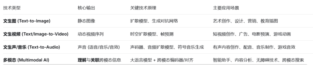 文生图、文生视频、文生声音、多模态这些AI生成技术虽然都涉及“输入文字生成内容”,但在技术原理、输出形态和应用场景上有本质区别。下面通过一个对比表格让你快速了解它们的核心差异: