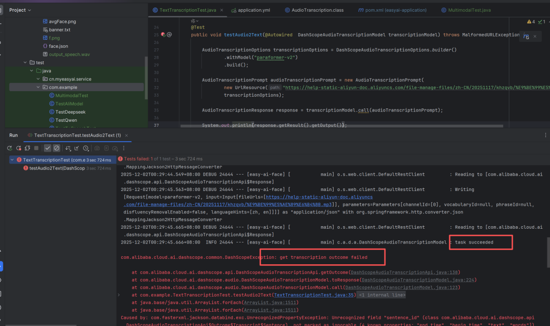 public void testAudio2Text(@Autowired DashScopeAudioTranscriptionModel transcriptionModel) throws MalformedURLException {