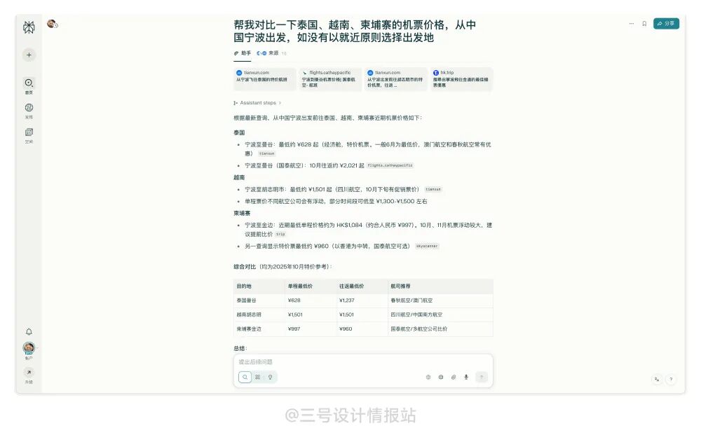 Comet试图解决的正是这个问题。你只需在当前页面输入:"帮我对比一下泰国、越南、柬埔寨的机票价格",系统就会在保持你阅读上下文的情况下,自动去多个航空公司网站获取信息,然后用一个对比表格呈现给你。