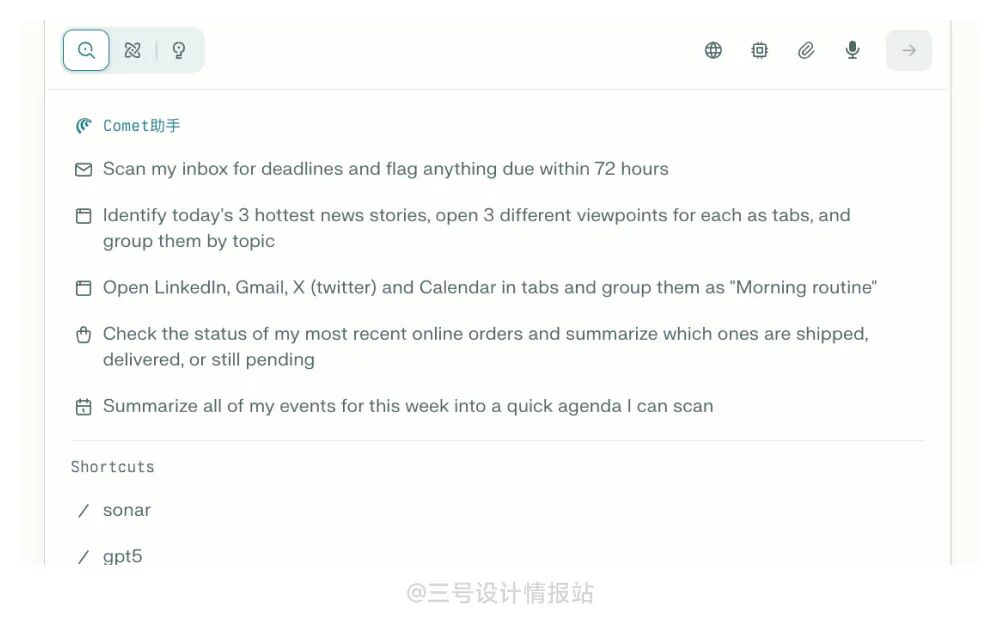 这里的差别很微妙但很重要。传统浏览器是在问"用户要去哪里",而Comet问的是"用户想要理解什么"。这不仅仅是功能的差异,而是设计思维从"任务导向"转变为"意图导向"。