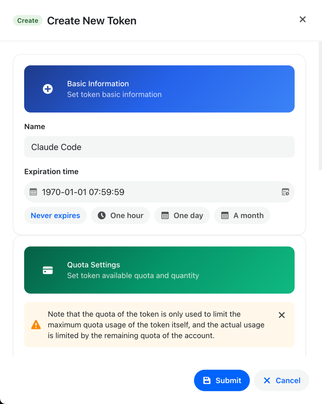 名称:随便取,比如「ClaudeCode」,方便识别即可;过期时间:直接设置为永不过期;额度:直接拉满,设置为「无限额度」;其他保持默认即可。