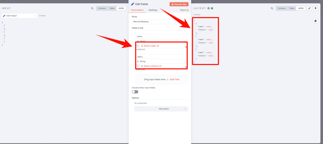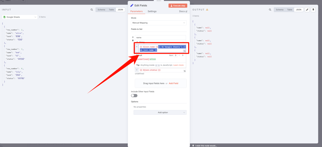 这时候,就需要利用节点名称来进行全局获取{{ $('xxx').item.json}}。