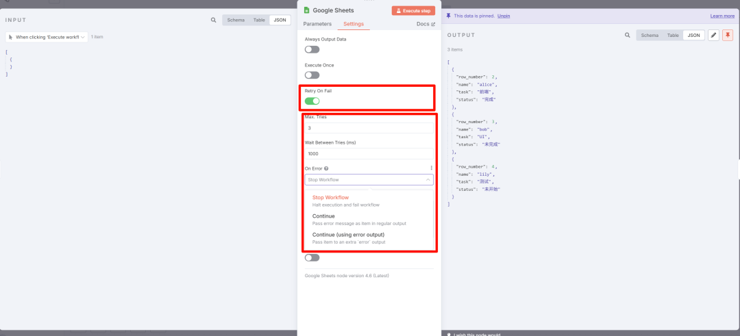 实际情况中,并不可能每次节点或者 API 都那么稳定,一次成功,所以很多情况下需要设置一个「失败重试(Retry On Fail)」。